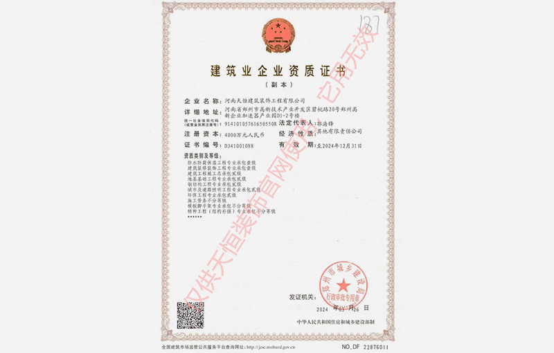 河南天恒建筑裝飾工程有限公司成立于2004年,注冊資金4000萬元,擁有正規(guī)的建筑裝飾工程設計專項乙級、建筑裝修裝飾工程專業(yè)承包壹級、防水防腐保溫工程專業(yè)承包壹級、地基基礎工程專業(yè)承包貳級、建筑工程施工總承包貳級、鋼結(jié)構工程專業(yè)承包貳級、城市及道路照明工程專業(yè)承包貳級、環(huán)保工程專業(yè)承包貳級等多個建筑業(yè)企業(yè)資質(zhì)。